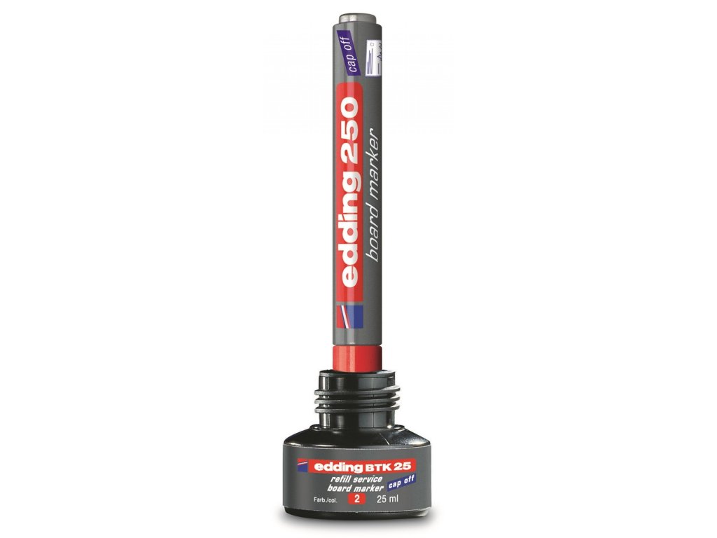 Atrament slabého zápachu s kapilárnym systémom na dopĺňanie popisovačov edding 250, 360, 361 a 363, určených na biele tabule. Tento chemický prípravok je nebezpečný. Obsah fľaštičky 25 ml.Pri doĺňaní vložte prednú časť popisovača špičkou do fľaštičky a po niekoľkých minútach bude popisovač pripravený k opätovnému použitiu.Farba: červená