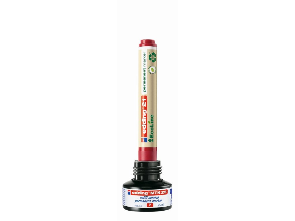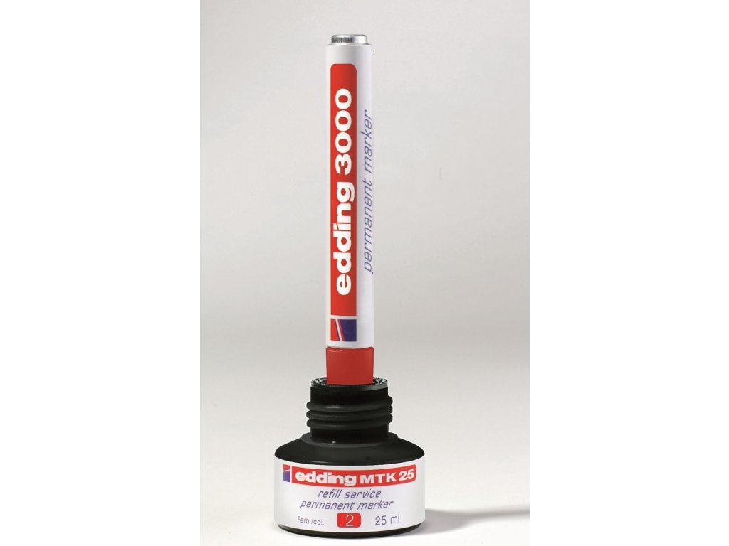 Atrament slabého zápachu s kapilárnym systémom na dopĺňanie permanentných popisovačov edding 2000/-2000 C, 2200/-2200 C, 400, 300, 330 a 370. Obsah 25 ml. Tento chemický prípravok je nebezpečný. Pri dopĺňaní vložte prednú časť popisovača špičkou do fľaštičky a po niekoľkých minútach bude popisovač pripravený k opätovnému použitiu. Obsah 25 ml.Farba: červená
