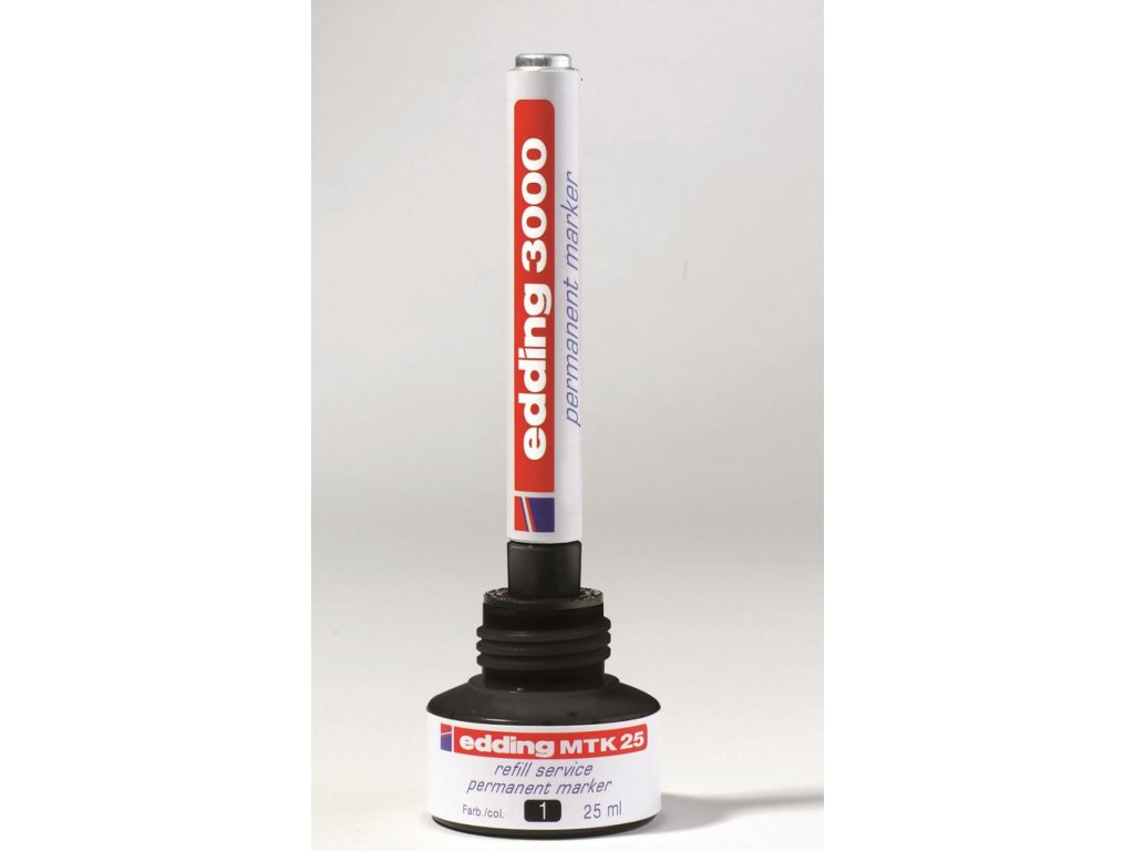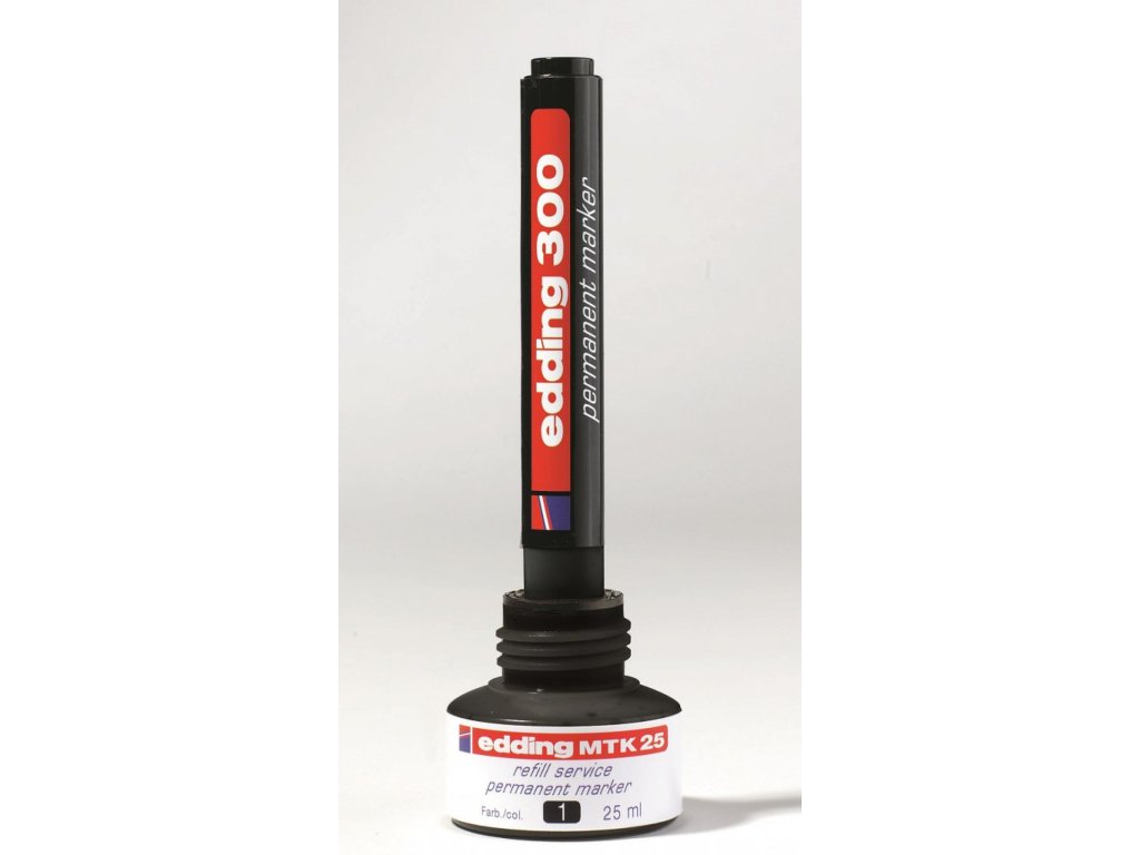 Atrament slabého zápachu s kapilárnym systémom na dopĺňanie permanentných popisovačov edding 2000/-2000 C, 2200/-2200 C, 400, 300, 330 a 370. Obsah 25 ml. Tento chemický prípravok je nebezpečný. Pri dopĺňaní vložte prednú časť popisovača špičkou do fľaštičky a po niekoľkých minútach bude popisovač pripravený k opätovnému použitiu. Obsah 25 ml.Farba: čierna