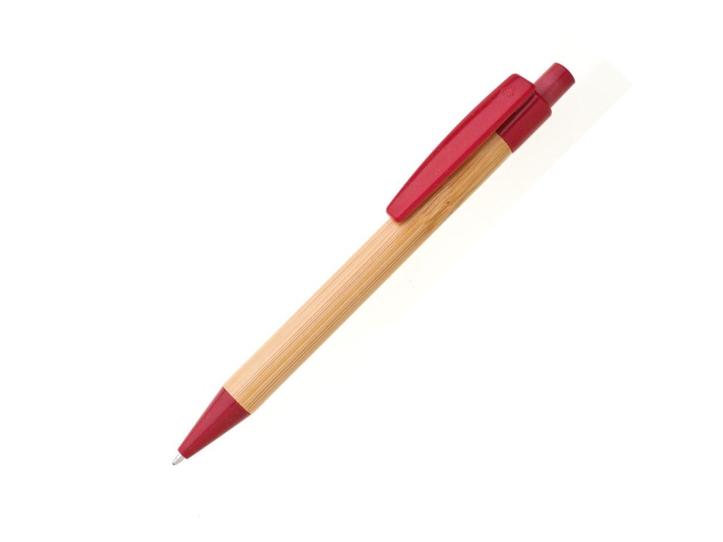 Bambusové telo pera s doplnkami z plastu s podielom slamy. Náplň modro píšuca veľkoobsahová. Farba červená.Dodatočné parametre