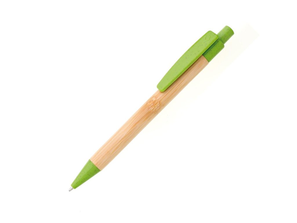 Bambusové telo pera s doplnkami z plastu s podielom slamy. Náplň modro píšuca veľkoobsahová. Farba svetlo zelená.Dodatočné parametre