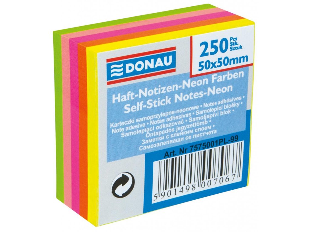 Malé samolepiace lístky v tvare kocky, 250-lístkové, v 5 neónových žiarivých farbách (5 × 50 lístkov). Ideálne na zanechávanie odkazov nielen v práci, ale i doma. Gramáž 75 g/m2.Rozmery 50 x 50 mm.