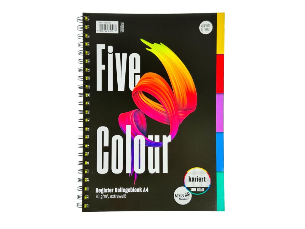 Blok formátu A4 s farebným registrom, mikro perforáciou a kovovou bočnou špirálou, vyrobený z kvalitného bieleho ekologického papiera 70 g / m2. 5-farebná registrácia na pravom okraji bloku. Každá farba registra obsahuje 20 listov papiera. Vonkajšia krycia fólia odpudzuje nečistoty a kvapaliny, pevný kartónový podklad.Úprava: štvorčeková