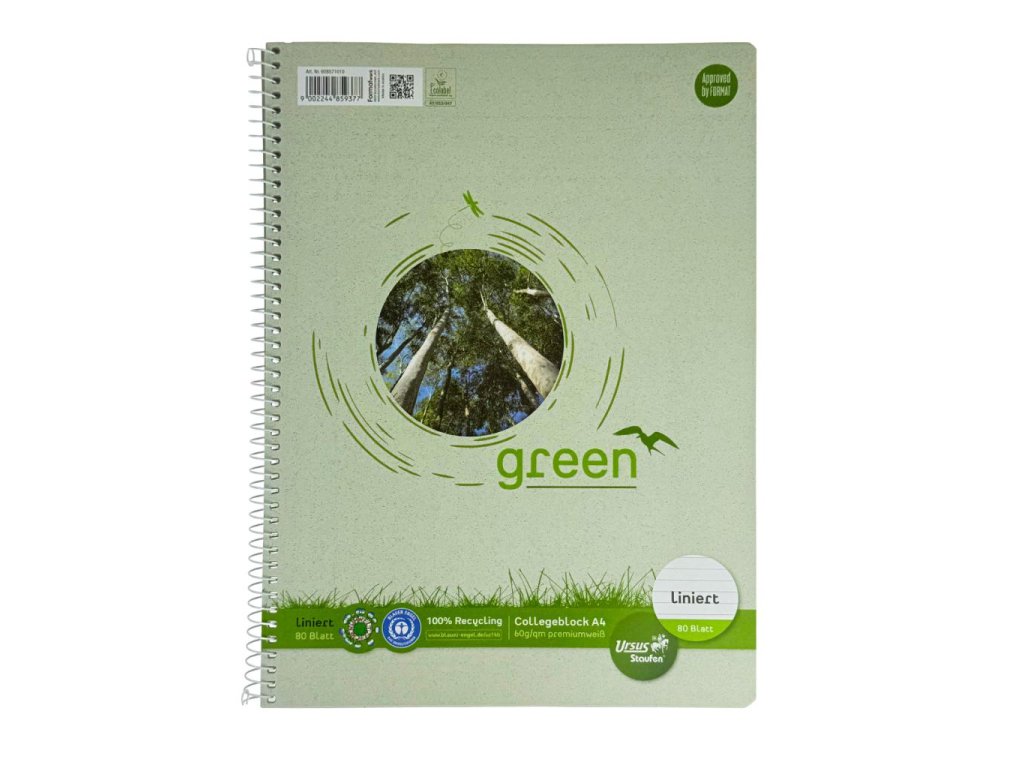 Ursus® Green - krúžkový blok so špirálou na boku vyrobený z vysoko kvalitného písacieho papiera s hmotnosťou 60 g / m2. 100%, papier vyrobený výlučne z recyklovaných vlákienDodatočné parametre