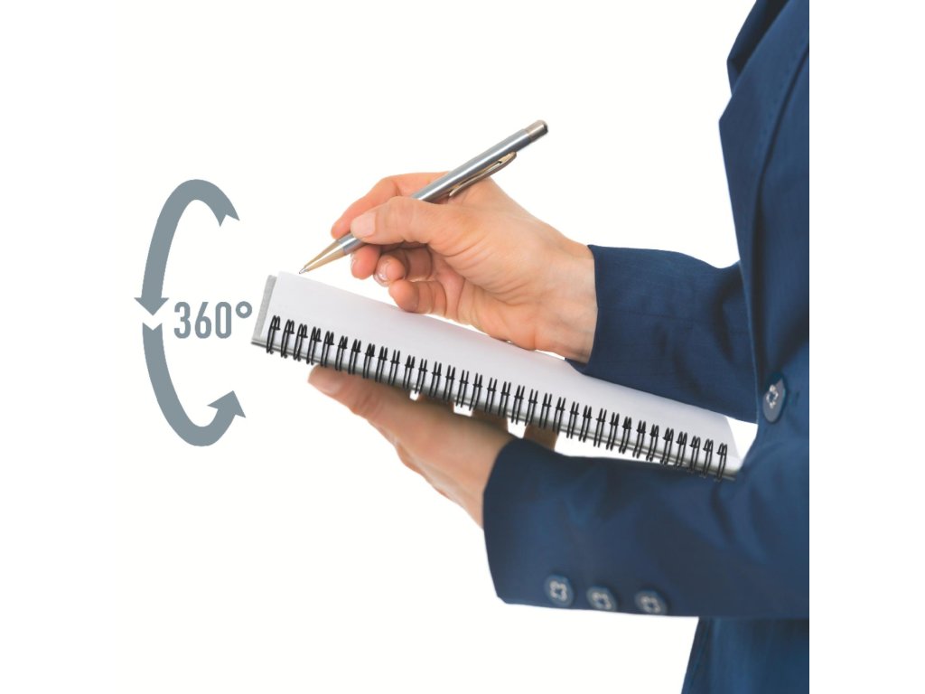 -Drôtená väzba umožňuje otvorenie poznámkového bloku v rozsahu 360 stupňov, prehnutý na polovicu môže poslúžiť ako podložka na písanie poznámok na cestách.