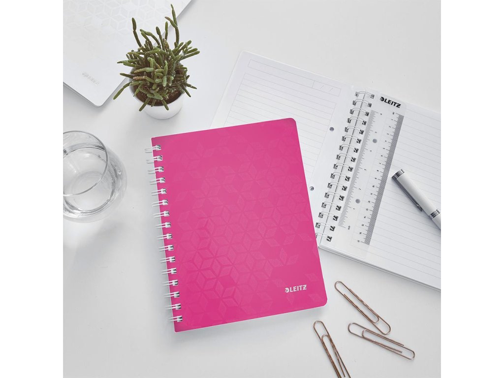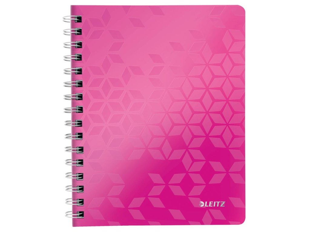 Krúžkový blok z dizajnovej rady Leitz WOW formátu A5 v žiarivých farbách. Vo vnútri biely papier s hmotnosťou 80 g / m2 s FSC® certifikáciou. Stránky sú perforované pre ľahšie odtrhávanie jednotlivých listov. Dvojitá drôtená krúžková väzba uľahčuje pretáčanie listov a zaisťuje dlhú životnosť bloku. Blok s pružnými doskami z polypropylénu obsahuje odnímateľné pravítko a vnútorné vrecko na uloženie voľných papierov, Väčšie balenie 6 ks. Farba metalická ružová.Úprava: linajková