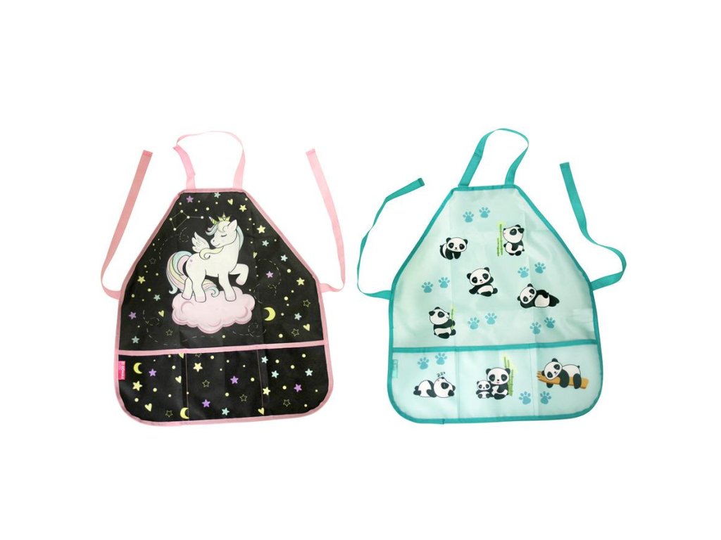 Detská maliarska/remeselnícka zástera v 2 rôznych vzoroch, s veľkým predným vreckom, s 3 vreckami na maliarske a remeselné potreby. Zapínanie na suchý zips pri krku a šnúrky vzadu, vrátane menovky. Materiál: polyester, univerzálna veľkosť: 54 x 46 cm. Motív pre dievčatá.Dodatočné parametre