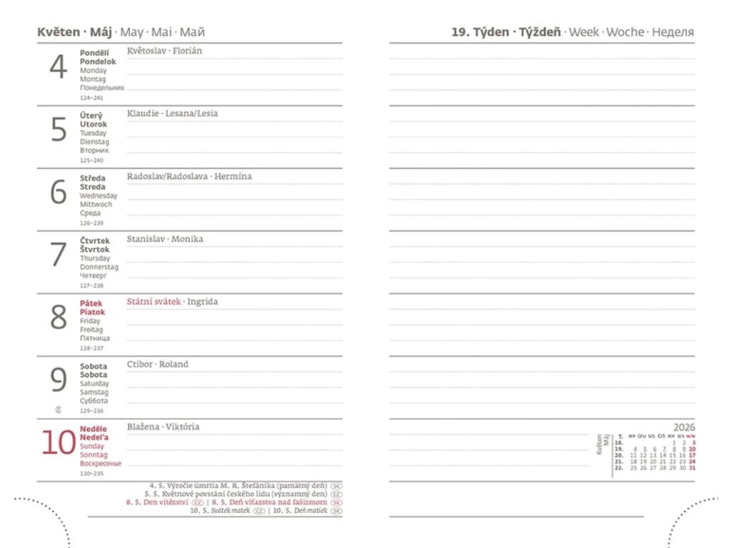 Dosky diára sú vyrobené z matného materiálu na báze zušľachteného papiera, ktorý je bez štruktúry a tým neruší vzhľad samotného produktu. Diár je doplnený gumičkou na uzavretie a pútkom na pero. Kompletný dizajn dopľňa obšitie dosiek niťou. Do diára možno raziť cez fóliu, prípadne ich potlačiť sieťotlačou.Diár obsahuje: osobné údaje, plánovač dovolenky (mesačný prehľad), plánovací kalendár, medzinárodné sviatky, ročný výhľad, týždenný layout, adresár.