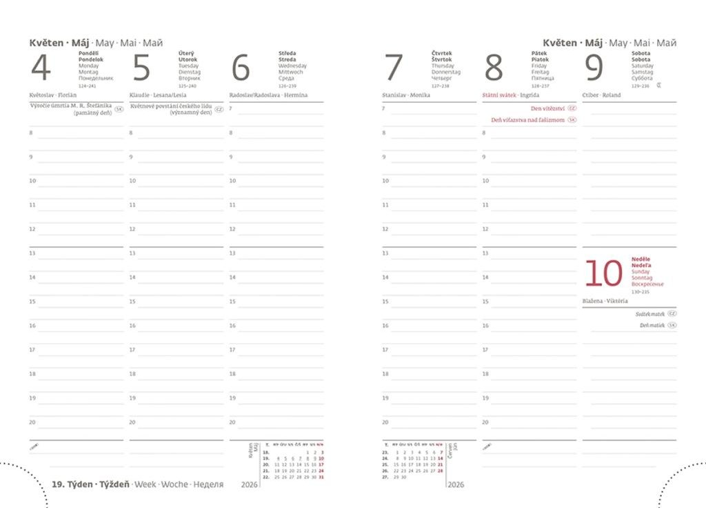 Dosky diára sú vyrobené z matného materiálu na báze zušľachteného papiera, ktorý je bez štruktúry a tým neruší vzhľad samotného produktu. Diár je doplnený gumičkou na uzavretie a pútkom na pero. Kompletný dizajn dopľňa obšitie dosiek niťou. Do diára možno raziť cez fóliu, prípadne ich potlačiť sieťotlačou.Diár obsahuje: osobné údaje, plánovač dovolenky (mesačný prehľad), plánovací kalendár, telefónne predvoľby, štátne sviatky Českej a Slovenskej republiky, medzinárodné sviatky, ročný výhľad, týždenný layout, adresár, mapa Európy a Českej a Slovenskej republiky.