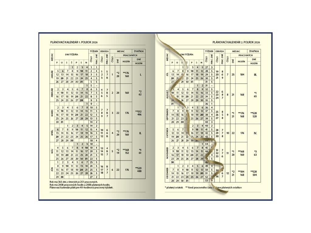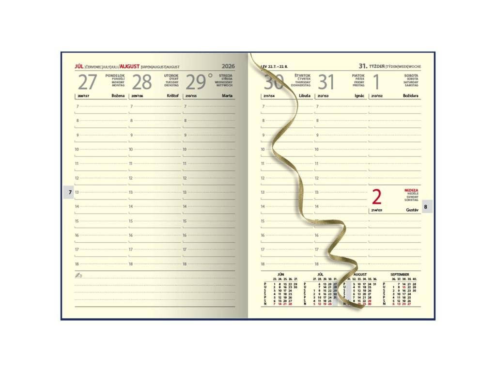 Obľúbený týždenný diár s prehľadným kalendáriom na celý týždeň. Diár je v pevnej väzbe s prednou penou so slovenským kalendáriom. Jednoduchý dizajn dopĺňa strieborná razba roku.Formát: 142 x 204