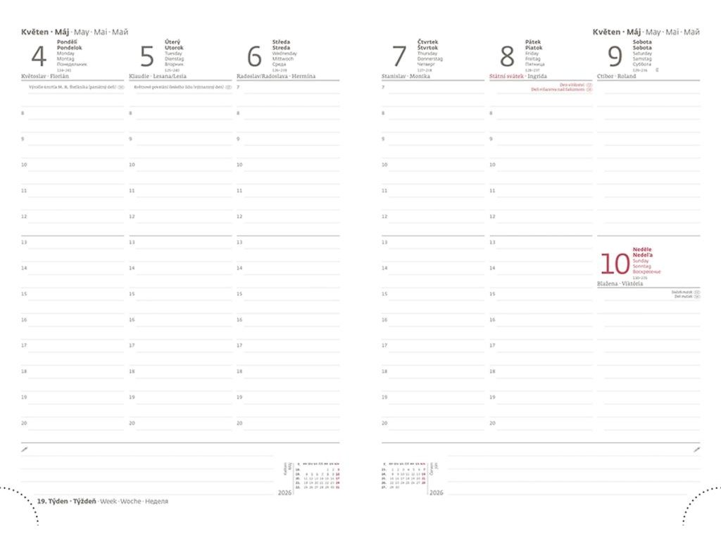 Dosky diára sú vyrobené z univerzálneho matného materiálu na báze zušľachteného papiera, ktorý je bez štruktúry, čím neruší vzhľad samotného produktu. Odporúčame tampónovú tlač.Diár obsahuje: osobné údaje, plánovač dovolenky (mesačný prehľad), plánovací kalendár, telefónne predvoľby, štátne sviatky Českej a Slovenskej republiky, medzinárodné sviatky, ročný výhľad, týždenný layout, adresár, mapa Európy a Českej a Slovenskej republiky.