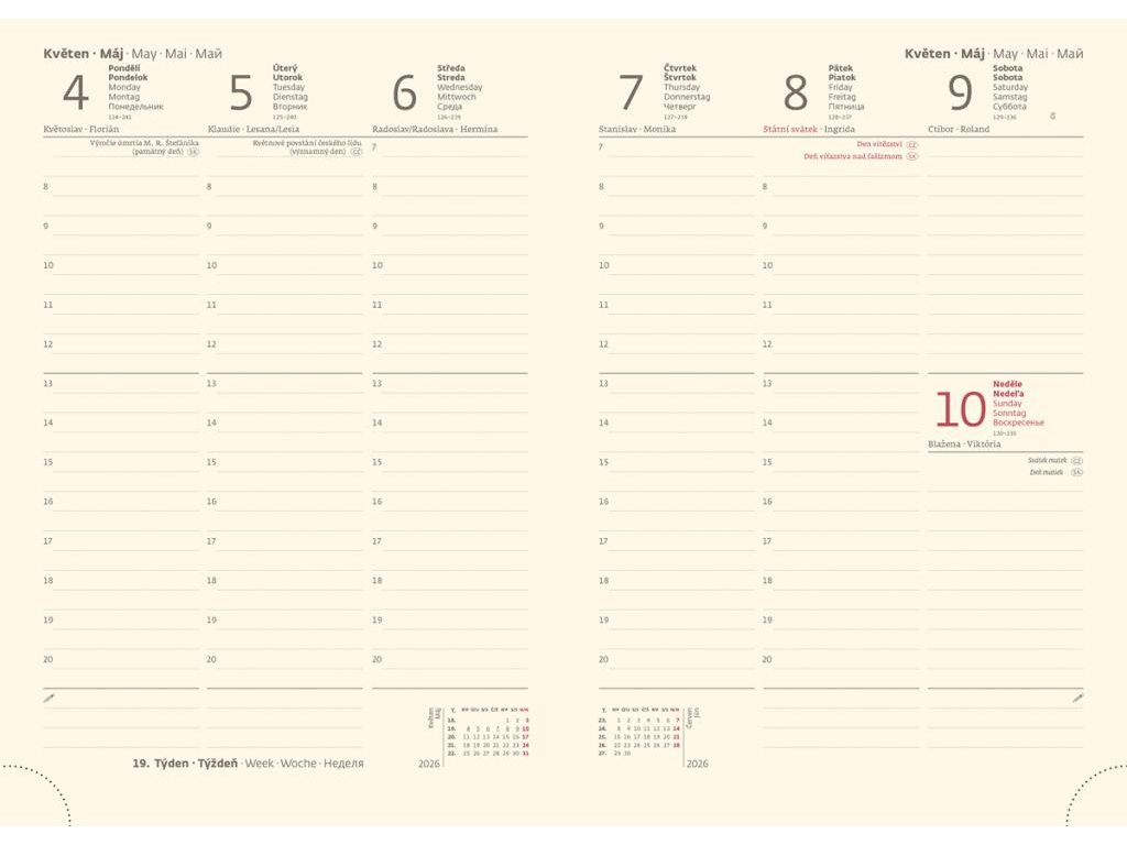 Ide o vysokokvalitnú, na dotyk príjemnú koženku, ktorá dokonale imituje kožu. Ide o lesklý materiál, do ktorého sa výborne razí bez fólie.Diár obsahuje: osobné údaje, plánovač dovolenky (mesačný prehľad), plánovací kalendár, telefónne predvoľby, štátne sviatky Českej a Slovenskej republiky, medzinárodné sviatky, ročný výhľad, týždenný layout, adresár, mapa Európy a Českej a Slovenskej republiky.