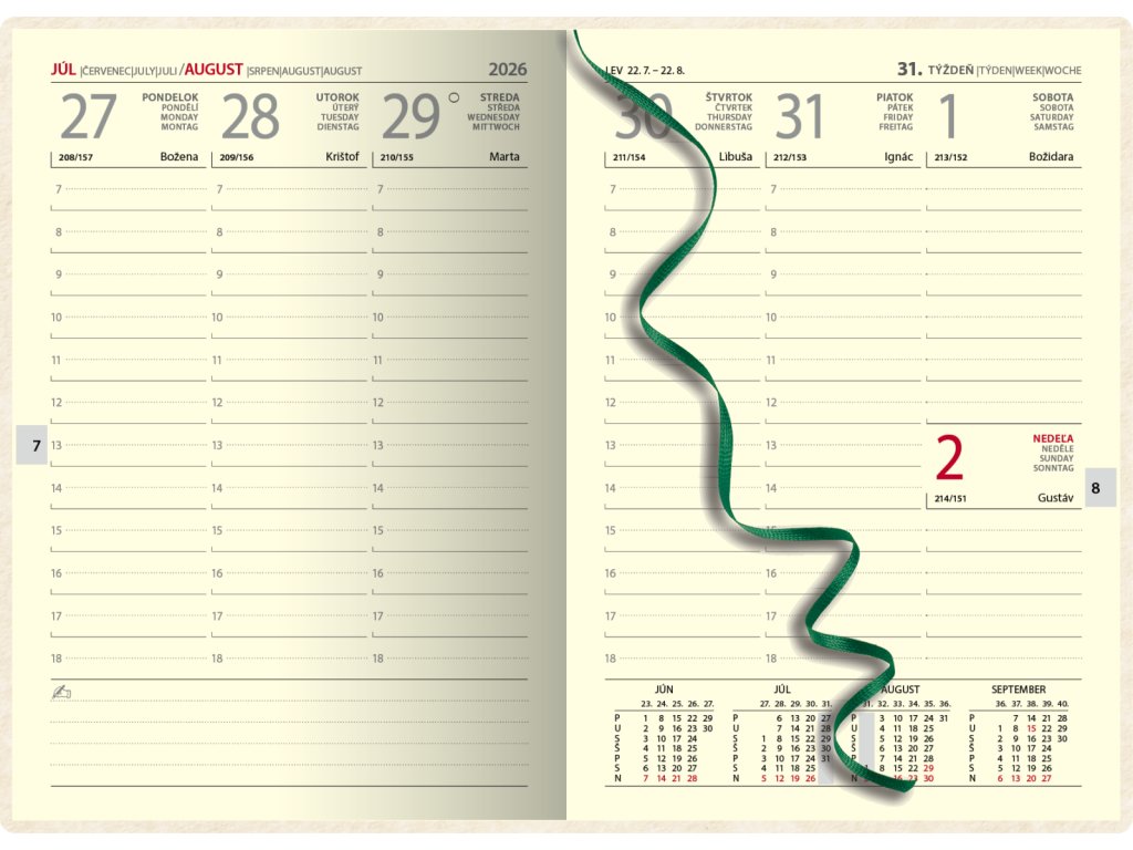 Certifikovaný týždenný diár s prehľadným slovenským kalendáriom na každý týždeň. Na obal je použitý vysokokvalitný papier NAPURA s prírodným dizajnom, 100 % recyklovateľný, s lacetkou. Vďaka vysokej kvalite vlákien je možná: termorazba, razba fóliou alebo ÚV tlač.Formát: 142 x 204