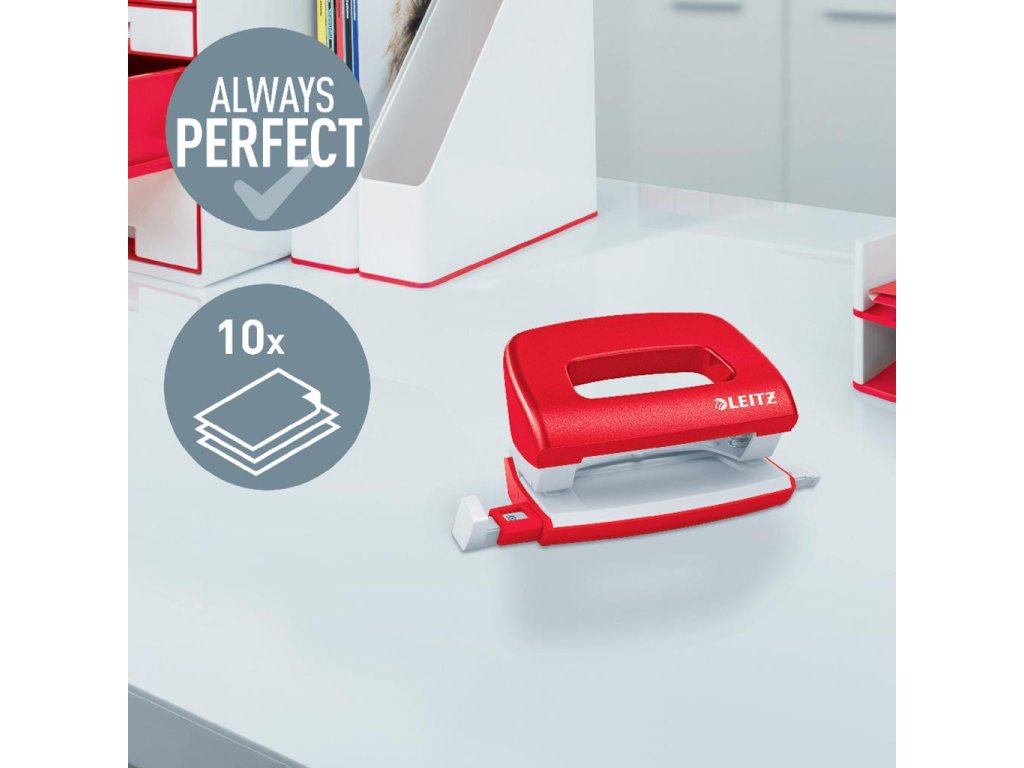 Odolná, praktická zošívačka s ergonomickou rukoväťou a v módnych farbách na použitie v kancelárii, doma alebo na cestách. Patentovaná príchytka a ostré dierovacie segmenty znižujú silu nutnú na dierovanie. Vhodná na použitie v ruke. Kapacita 10 hárkov. Ergonomický kompaktný dizajn. S pohodlnou príchytkou s ostrými dierovacími segmentmi. Farba červená. Kapacita dierovania: 10 hárkov (80 g/m2)Ergonomická príchytka ľahšie dierovanie