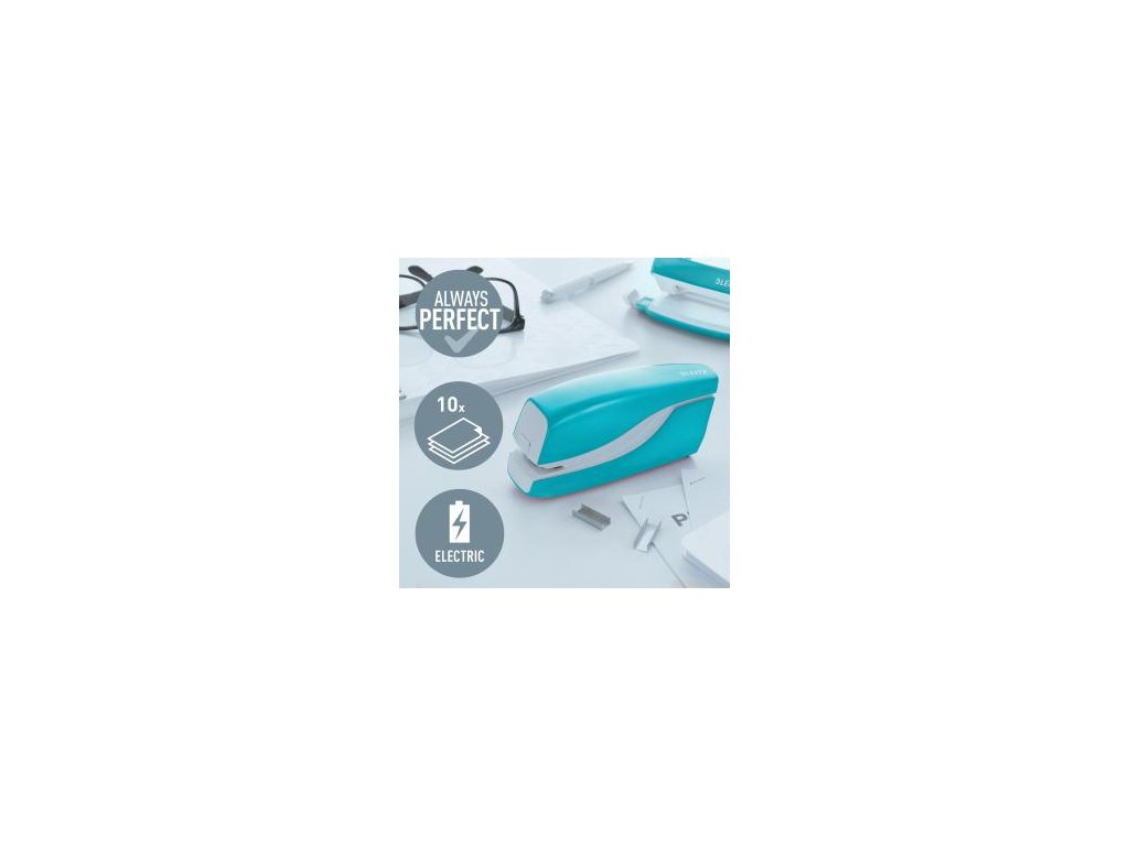 Elektrická zošívačka Leitz New NeXXt WOW. Vďaka jednoduchému ovládaniu jednou rukou je ideálna na časté používanie.Technológia s napájaním na batérie na zošívanie v pohybe. V žiarivých farbách WOW. Batérie (4× 1,5 V AAA LR03) nie sú súčasťou balenia. Kapacita 10 listov. Náhradné spinky ES556800. Farba ľadovo modrá.