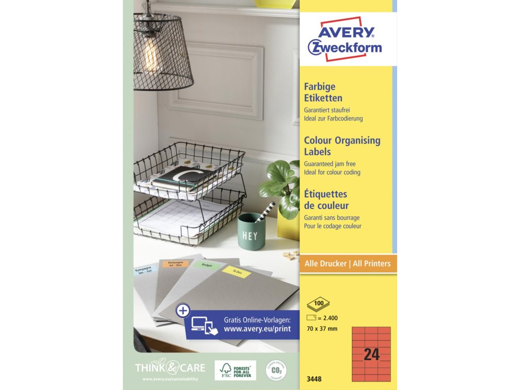 Etikety farebné 70x37mm Avery A4 100 hárkov červené