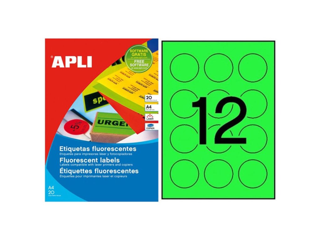 Etikety kruhové farebné priemer 60 mm APLI A4 20 hárkov fluo zelené
