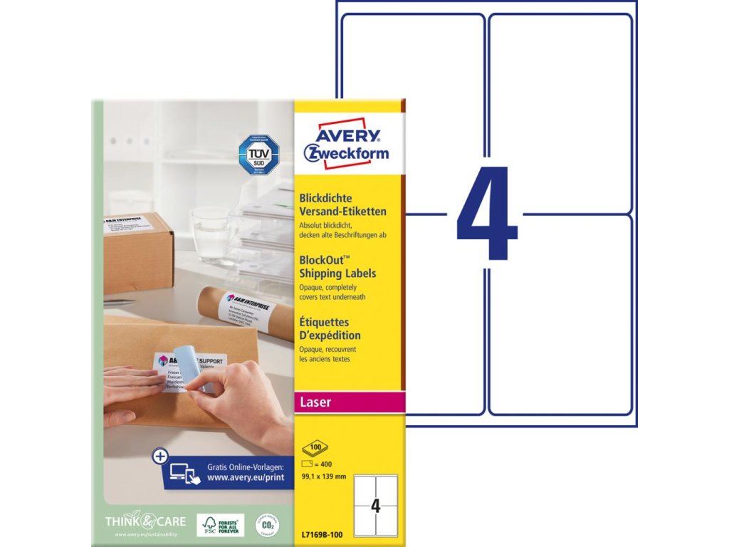 Biele etikety vhodné ako prepravné štítky na zásielky. Vďaka inovatívnej technológii ultragrip sa môžete spoľahnúť na bezchybné natiahnutie archu a tlač bez zasekávania. Bezpečnostný okraj QCT zabraňuje zanášaniu tlačiarne lepidlom. Rýchla technológia QuickPEEL™ zabezpečí, že etiketu odlepíte z podkladového papiera za sekundu. Šablóny a softvér pre jednoduchú a rýchlu tlač etikiet sú k dispozícii zdarma na www.avery-zweckform.cz/software/avery-design-print. Sú vhodné pre všetky štandardné laserové tlačiarne. Pre laserové tlačiarne testované a certifikované TÜV SÜD. Rozmer 99,1 x 139 mm. Balenie 100 hárkov.Dodatočné parametre