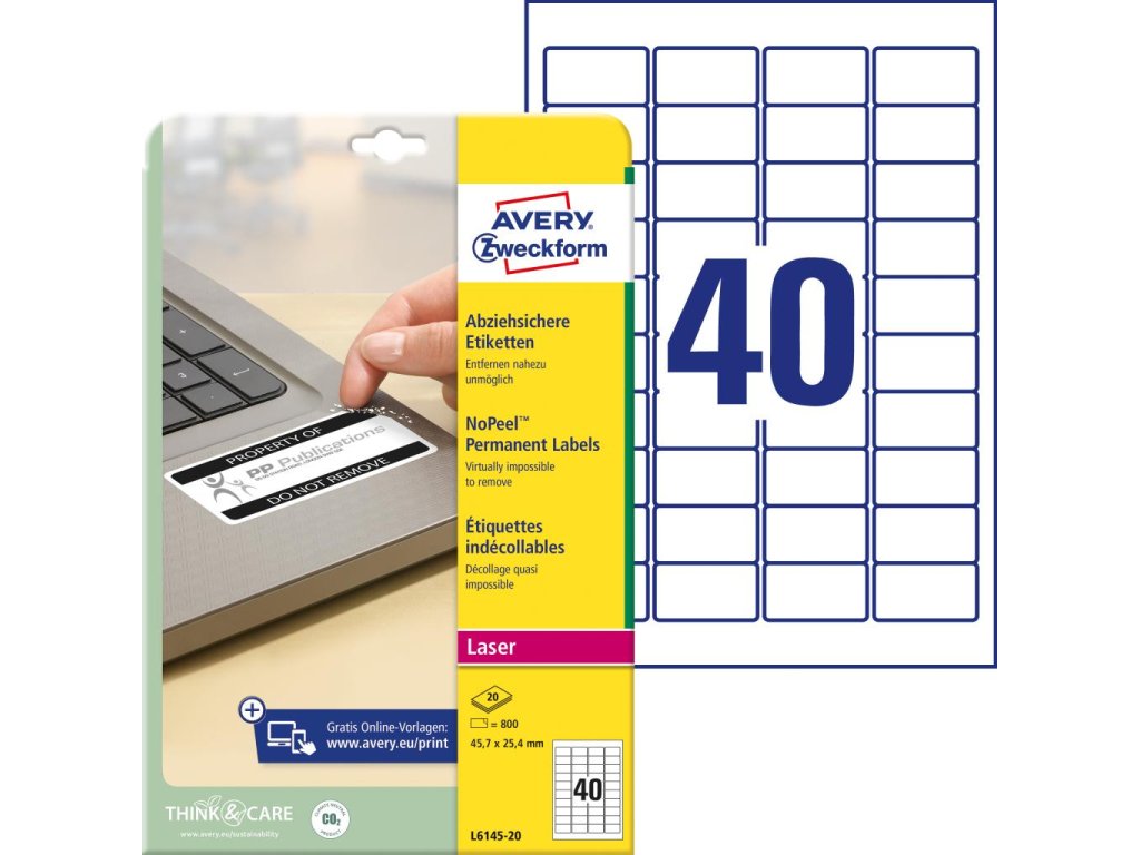 Etikety Avery Zweckform so skvelou ochranou pred neoprávnenou manipuláciou. Ak sa pokúsi niekto etiketu odstrániť, materiál sa rozpadne a etiketu bude možné odlepiť len po veľmi malých častiach. Tieto etikety sa skvele hodia na bezpečnostné značenie, kalibračné značky a inšpekčné plomby. Etikety sú navyše odolné voči mastnote, špine, vode a teplotám od -40 °C do +120 °C. Rozmer 45,7 x 25,4 mm, 800 etikiet.-Odolné voči mastnote, znečisteniu, vode a extrémnym teplotám.
