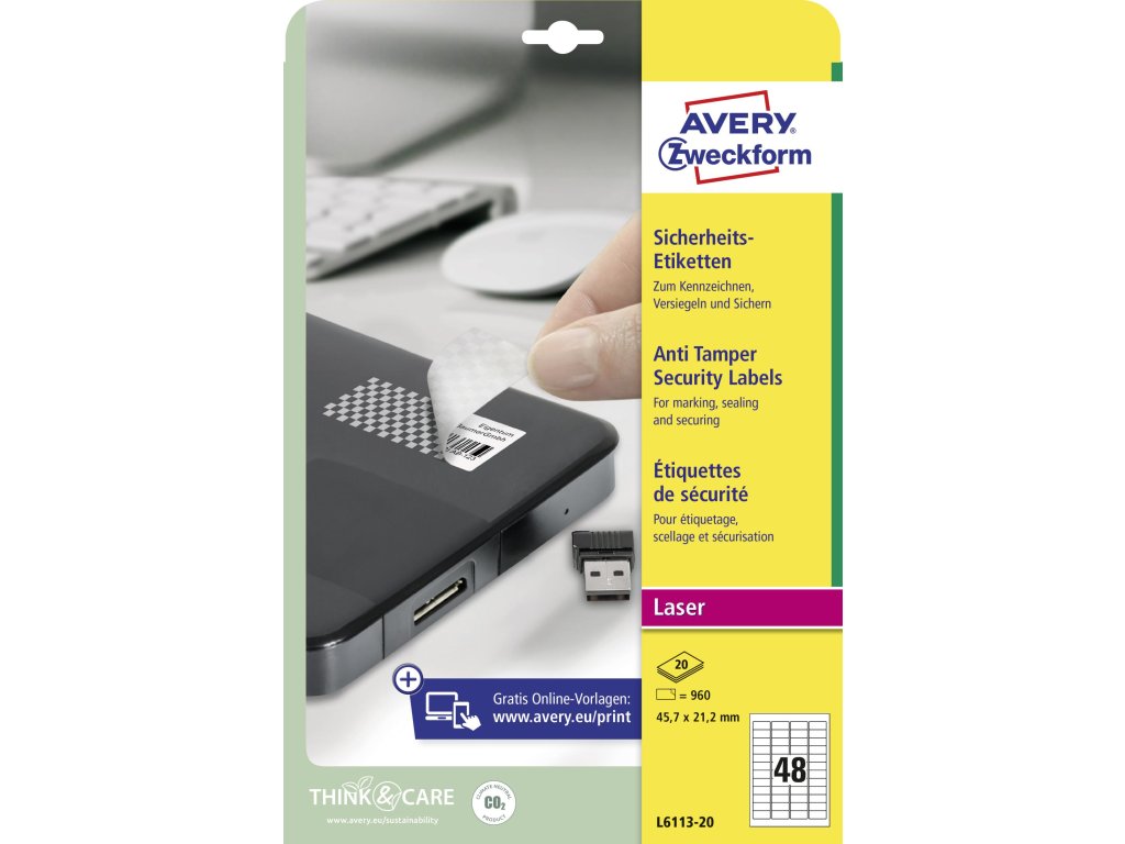 Etikety Avery Zweckform s ochranou proti manipulácii oceníte predovšetkým pri označovaní hodnotných predmetov, kancelárskeho nábytku alebo elektroniky. Pokiaľ sa etikety niekto snaží odstrániť, zanechávajú po sebe viditeľný šachovnicový vzor. Nie je možné ich znovu nalepiť, takže akákoľvek manipulácia je ihneď zrejmá. Rozmer 45,7 x 21,2 mm, 960 etikiet.-Pri odstraňovaní štítok zanecháva na povrchu viditeľný šachovnicový vzor