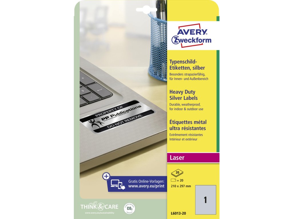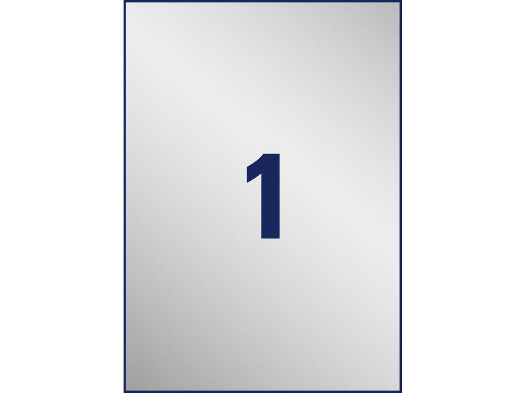 Veľmi odolné polyesterové etikety odolné voči oleju, prachu, špine, natrhnutiu, vode. Odolávajú teplotám od −40 ° do + 150 °C. Určené pre tlač v laserových tlačiarňach. Vhodné aj pre vonkajšie použitie. Rozmery v mm : 210 × 297. Farba strieborná. Etikety na hárku 1 kus. Balenie 20 hárkov.Dodatočné parametre