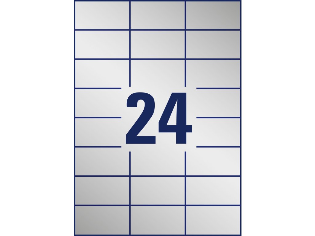 Veľmi odolné polyesterové etikety odolné voči oleju, prachu, špine, natrhnutiu, vode. Odolné voči teplotám od -40° do +150°C. Sú určené pre tlač v laserových tlačiarňach a sú vhodné aj pre vonkajšie použitie. Rozmery v mm : 70 × 37. Farba strieborná. Etikety na hárku 24 kusov. Balenie 20 hárkov.Dodatočné parametre