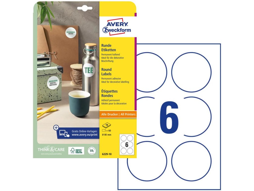 Biele kruhové univerzálne etikety vhodné na každodenné použitie v atramentových a laserových tlačiarňach a kopírovacích strojoch. Ostrá tlač bez bez rozmazávania. Etikety su vyrobené spôsobom šetrným k životnému prostrediu, majú certifikáciu FSCR, sú bielené bez použitia chlóru. Šablóny a softvér pre jednoduchú a rýchlu tlač etikiet k dispozícii zdarma. Formát A4. Balenie 10 hárkov. Priemer 80 mm.Dodatočné parametre