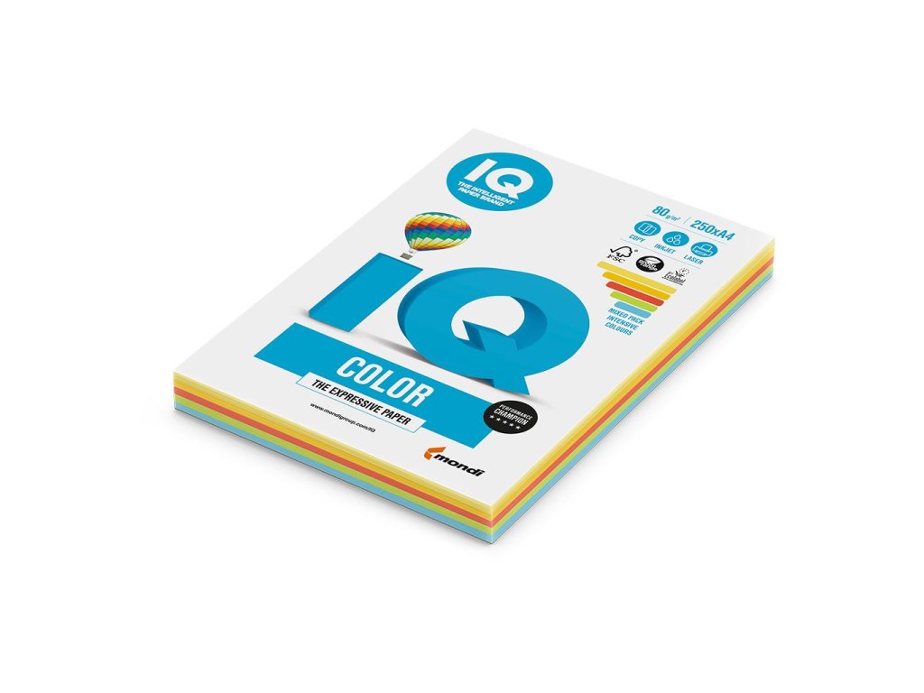 Farebné kopírovacie papiere IQ color v balení 5 farieb po 20 hárkov v intenzívnych farbách: kanárikovožltá CY39, slnečná žltá SY40, korálovočervená CO44, tmavozelená MA42, azúrovomodrá AB48.Formát: A4