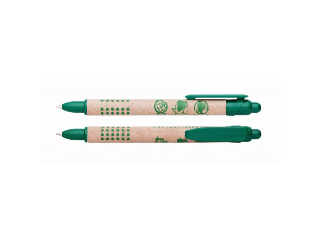 Klikacie guľôčkové pero vyrobené zo 100 % recyklovaného papiera a 30 % recyklovaného plastu. Zostavené s náplňou X-20. Dĺžka písania 2500 m. Papierové časti sú recyklovateľné. Náplň nie je vymeniteľná, ale je odnímateľná pre selektívnu likvidáciu odpadu. Guľôčka 0,8 mm. Farba tuhy: modrá.Dodatočné parametre