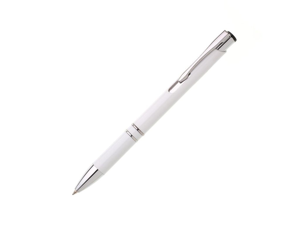 Plastové guľôčkové pero OIRA s kovovými doplnkami. Modrá náplň veľkoobjemová. Farba biela.Dodatočné parametre