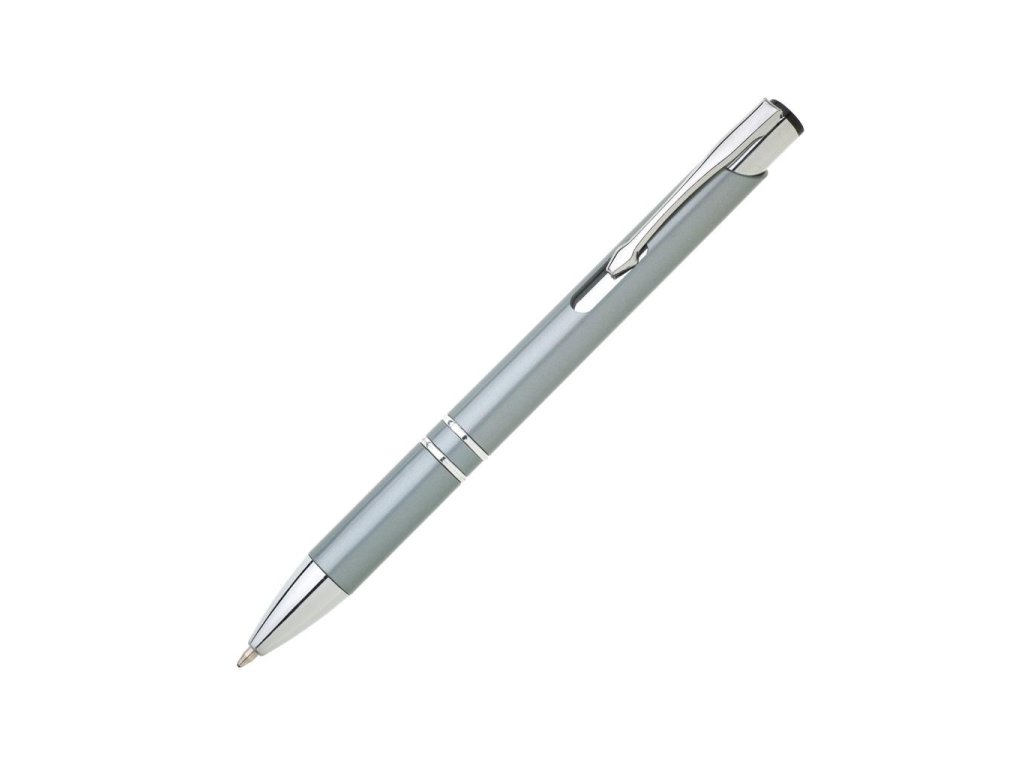 Plastové guľôčkové pero OIRA s kovovými doplnkami. Modrá náplň veľkoobjemová. Farba sivá.Dodatočné parametre