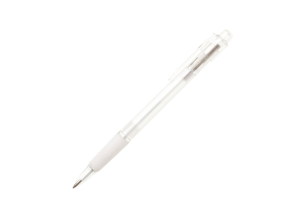 Guľôčkové pero plastové PROSTO s priehľadným farebným telom a pogumovaným úchopom . Modrá náplň X-20. Farba biela.Dodatočné parametre