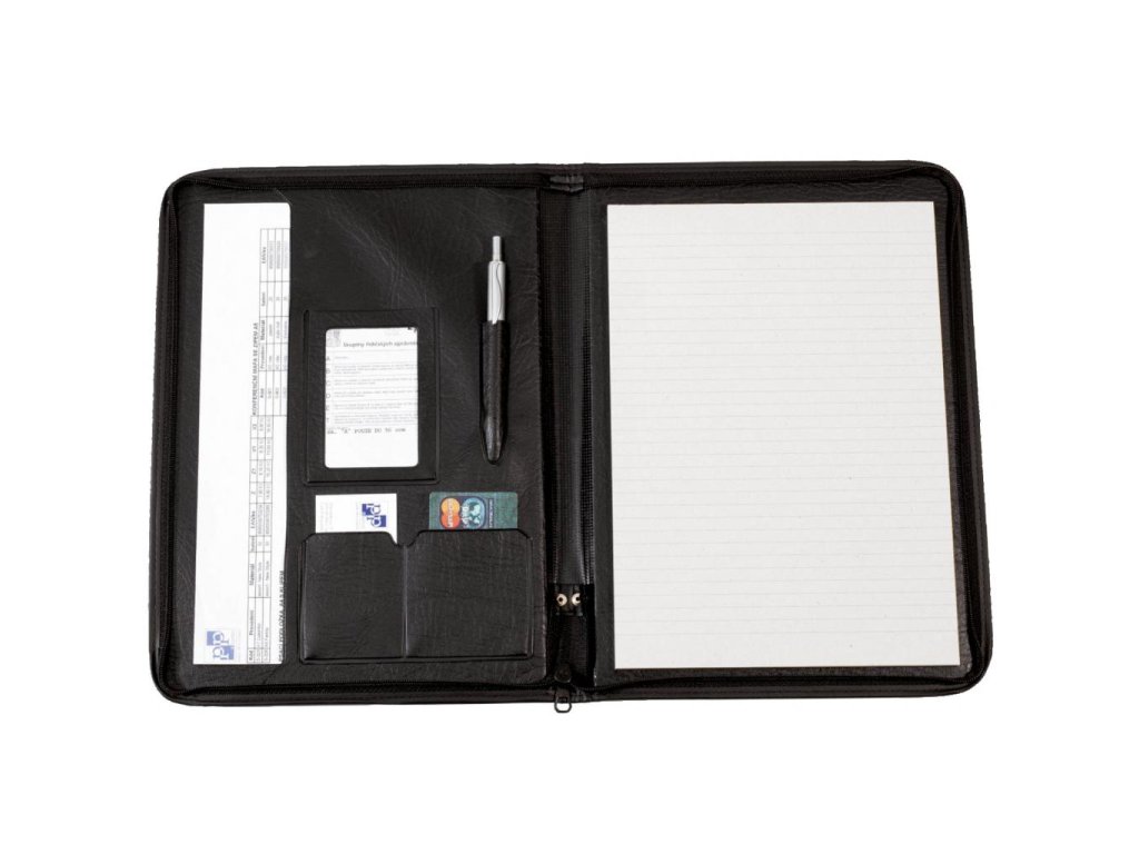 Konferenčná mapa so zipsom, vybavená vreckami niekoľkých veľkostí a linajkovým poznámkovým blokom, bez mechaniky. V prevedení imitácie kože, úprava matná. Šírka chrbta 20 mm.Farba: čierna