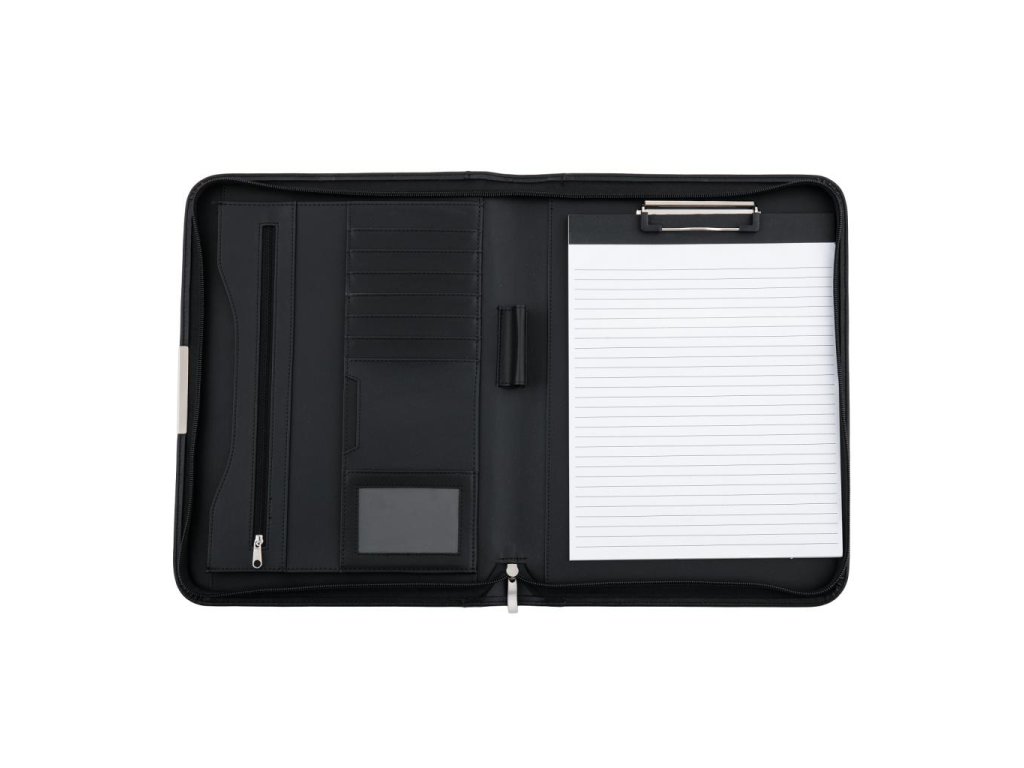 Konferenčná mapa so zipsom, vybavená písacou podložkou, vreckami na dokumenty a vizitky, úchytmi na písacie potreby a linajkovým poznámkovým blokom. V prevedení imitácie kože, úprava matná. Šírka chrbta 35 mm.Farba: čierna