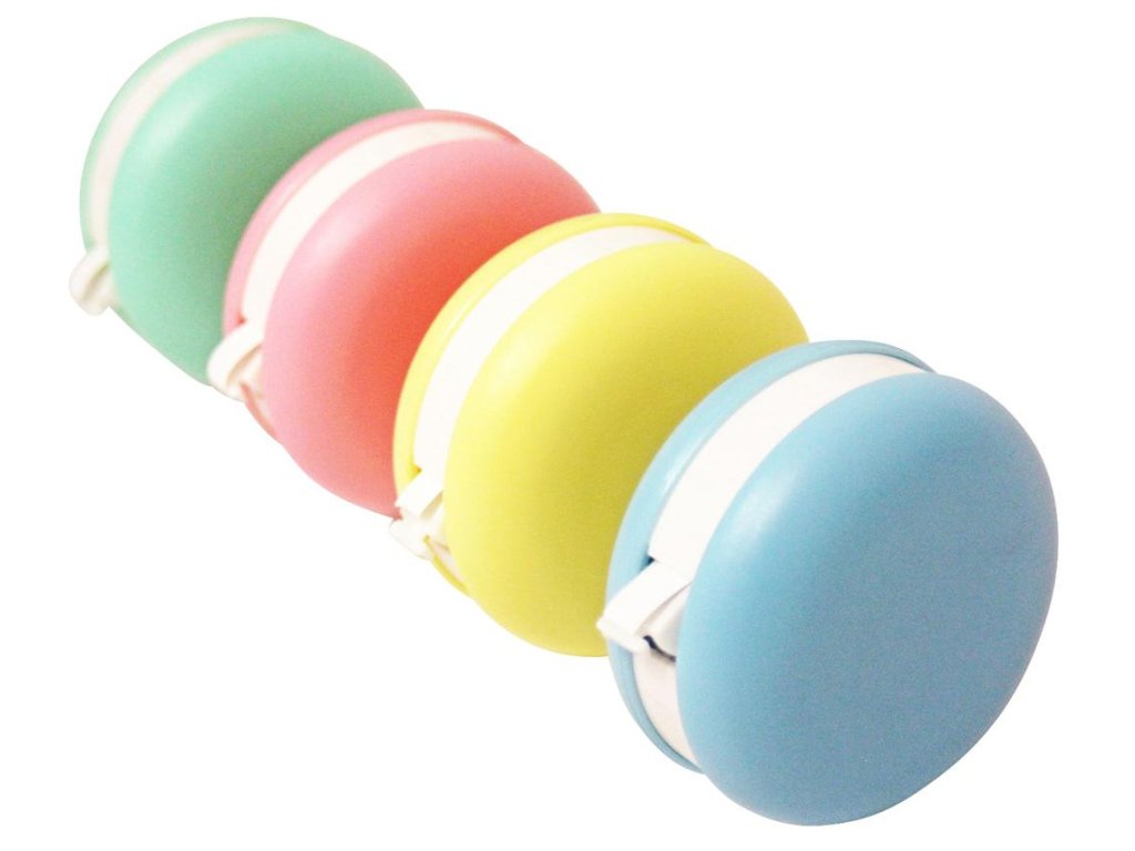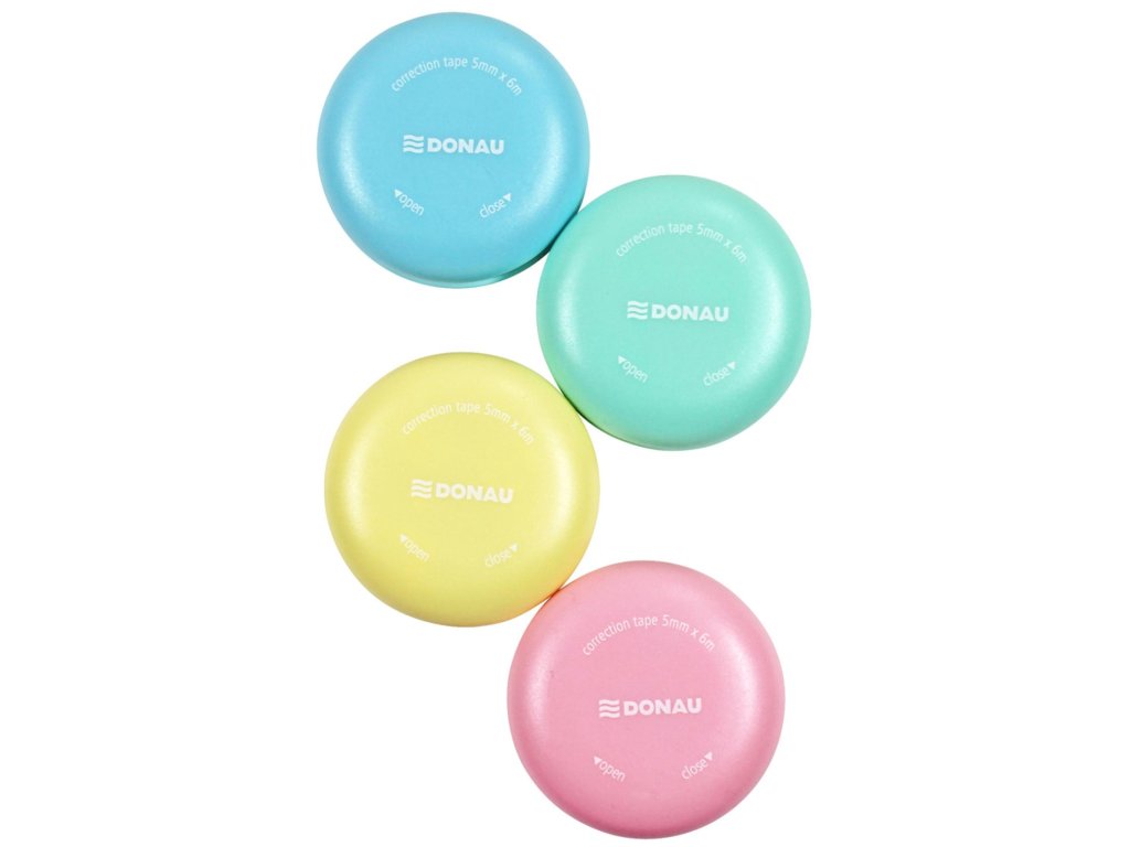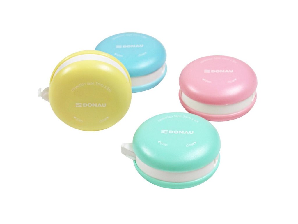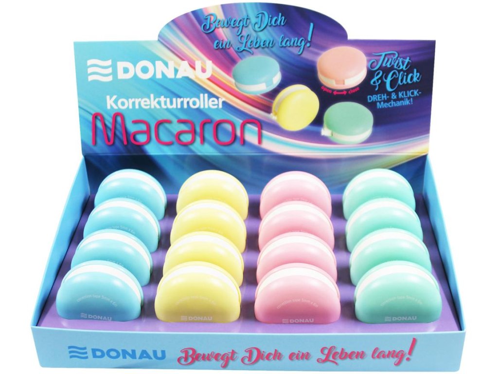 Korekčný roller v tvare makrónky, 16 ks na displeji, 4 rôzne farby tela, priemer 5 cm, dĺžka pásky 6 m, šírka pásky 5 mm, otváranie a zatváranie pomocou mechanizmu twist & click.Dodatočné parametre