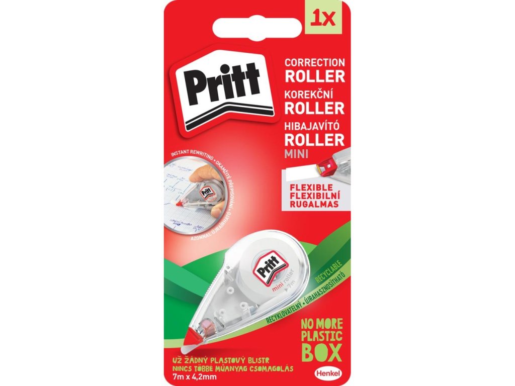 Malá a praktická jednorázová korekčná páska pre všetky bežné druhy papierov a fólií. Nanesený korekčný film je suchý a umožňuje okamžité písanie. Nová technológia opravy textu zaručuje čistú a presnú korekciu. Na kópiách nezanecháva tmavé okraje a tiene. Šírka stopy 4,2 mm je ideálna na opravy textov, písaných strojom. Návin 7 m. Väčšie balenie 10 ks.Návin: 7 m