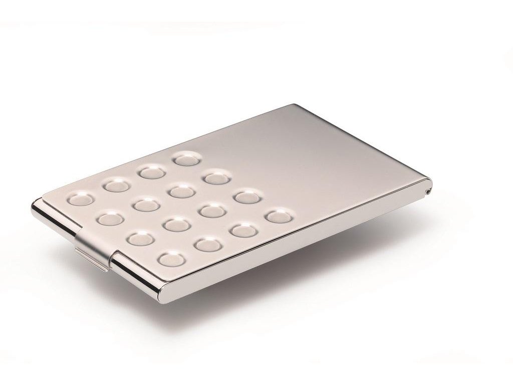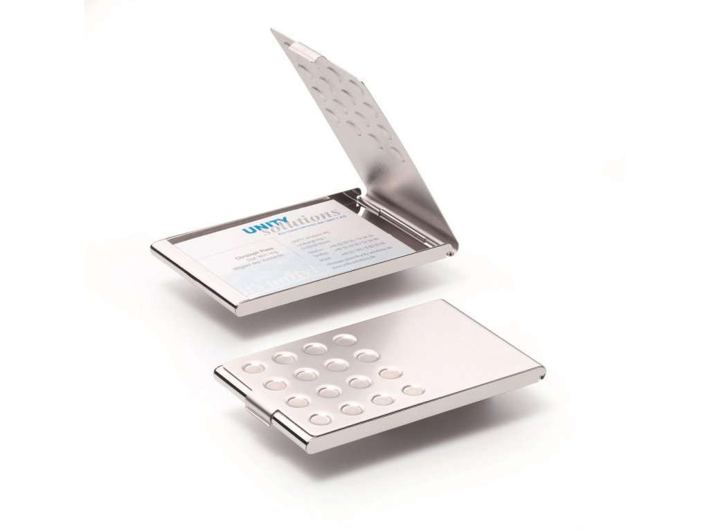 Elegantná pochrómovaná krabička na vizitky. Vnútorné rozmery 95 × 58 mm. Kapacita 20 vizitiek. Lesklá úprava. Farba strieborná.Vnútorné rozmery: 95 x 58 mm