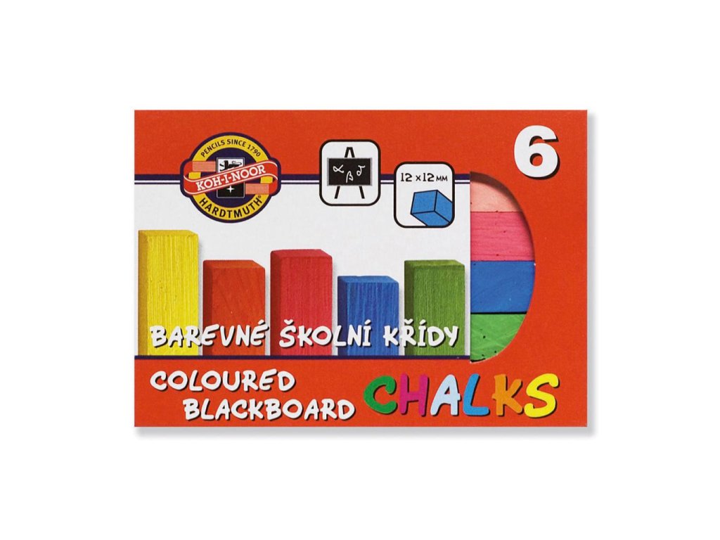 Farebné kriedy na školské tabule. Rozmery 12 x 12 x 100 mm. Dodávané v sade 6 farieb (žltá, oranžová, karmínová, tmavomodrá, tmavozelená, hnedá). Väčšie balenie 40 sád.Dodatočné parametre