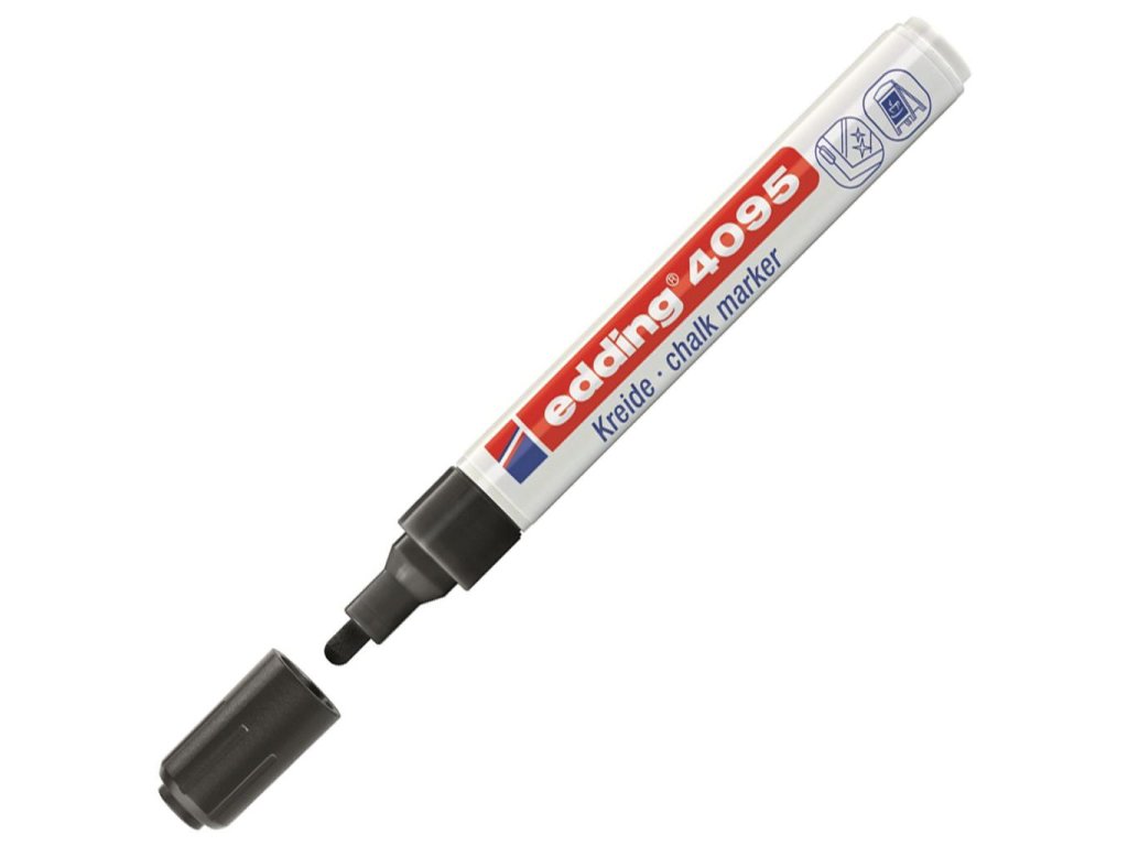 Tekutá krieda na báze vody. Popisovač určený na návrhy, dekorácie a značenie na sklo, okná, tabule a iné nepórovité povrchy. Okrúhly hrot, bez zápachu, zmazateľný vlhkou handričkou z takmer všetkých nepórovitých povrchov. Farba čierna. Väčšie balenie 10 ks. Hrúbka hrotu 2-3 mm. Farba čierna.Dodatočné parametre