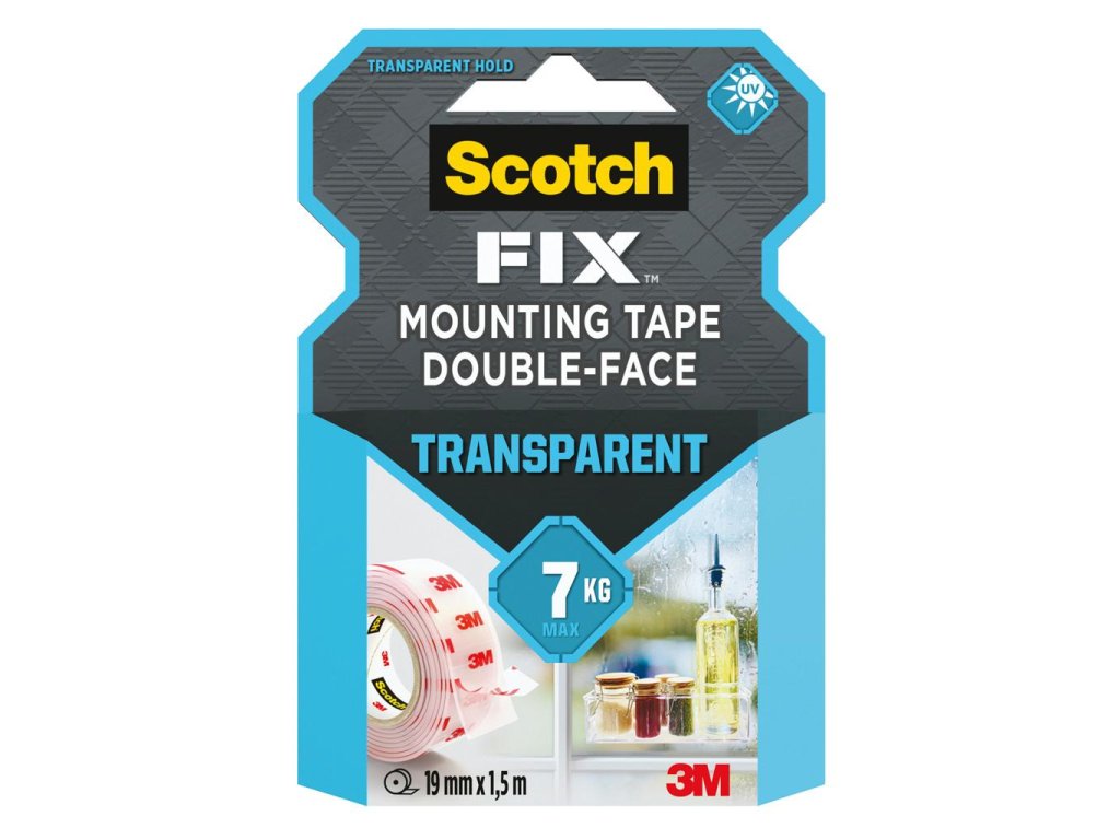 Transparentná obojstranná montážna páska, odolná voči vode a UV žiareniu. Nosnosť 2 kg na 30 cm pásky. Použitie na: sklo, dlaždice, akryl a kov. Väčšie balenie 12 ks. Rozmery 19 mm × 1,5 m.Dodatočné parametre