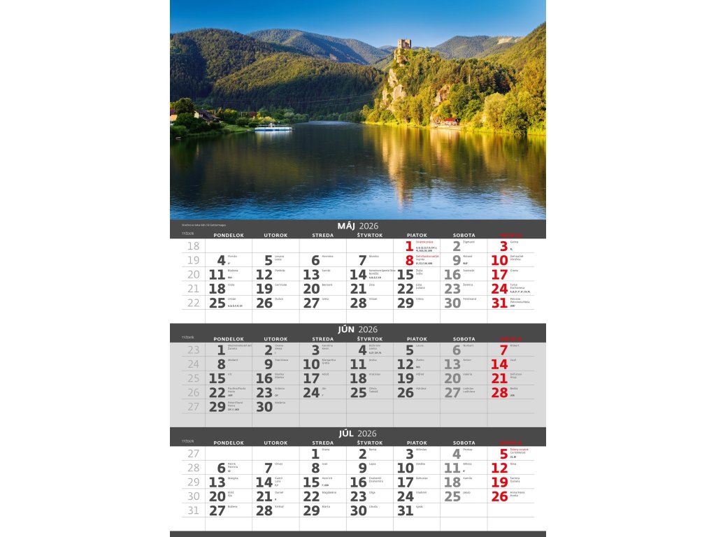 Formát kalendára: 31,5 x 45 cmKalendárium: slovenské trojmesačné so sviatkami európskych štátov (CZ / SK / A / B / D / F / H / CH / I / PL / RUS / UKR)