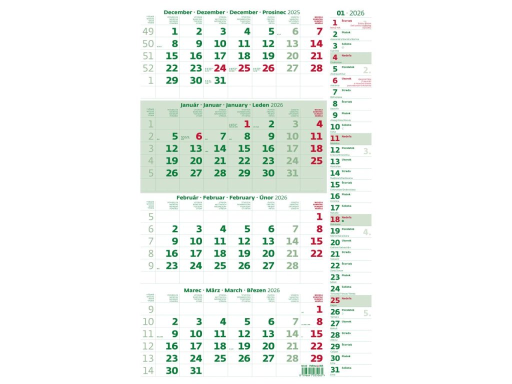 Formát kalendára: 31,5 x 49 cmKalendárium: slovenské štvormesačné menné + sviatky vybraných európskych štátov (CZ / SK / A / B / D / F / H / CH / I / PL / RUS / UKR)