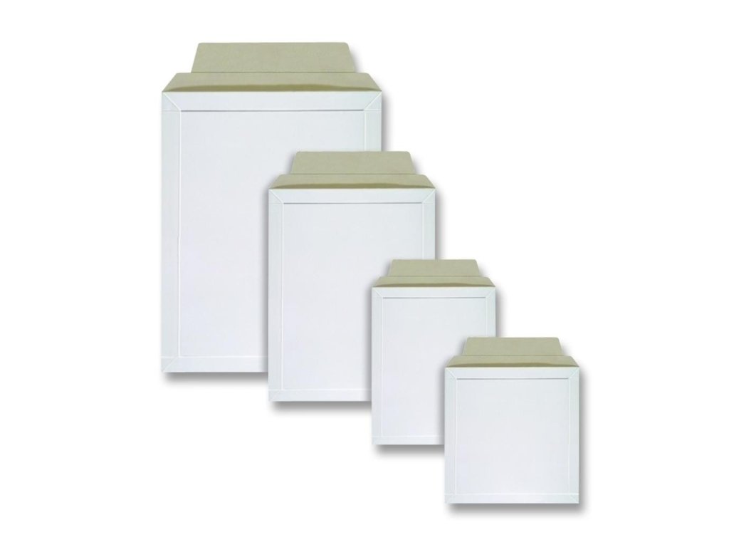 Biele priestorové obálky z tuhého kartónu, zabraňujú poškodeniu zásielky.skladačková lepenka 300 g/m2