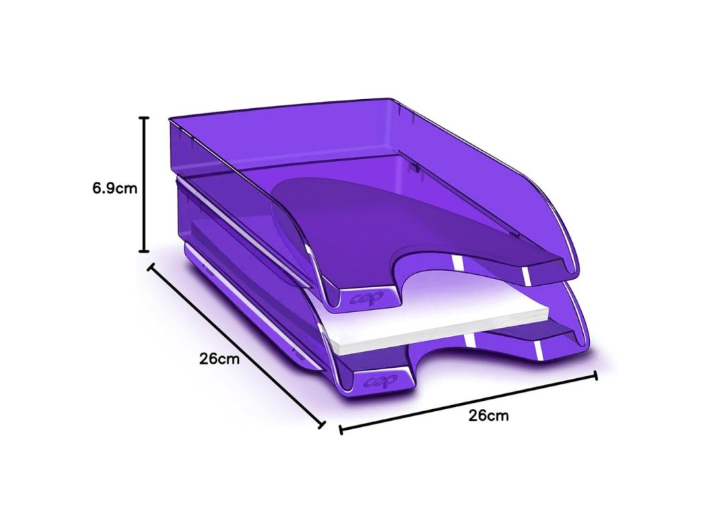 Vďaka štíhlym a elegantným líniám si tento odkladač nájde miesto nielen na stole, ale aj na bočnom stole alebo v skrini. Je vhodný na dokumenty do veľkosti 24 × 32 cm. Široký čelný výrez umožňuje ľahké vyberanie obsahu. Odkladač je stohovateľný vertikálne, aj stupňovito dozadu. Kapacita 450 listov (80 g / m²). Celkové rozmery 257 × 348 × 66 mm. Materiál 100% odolný vysokokvalitný plast. Jednotlivé kusy sa môžu navzájom jemne farebne líšiť. Väčšie balenie 10 ks. Farba transparentná fialová.Dodatočné parametre