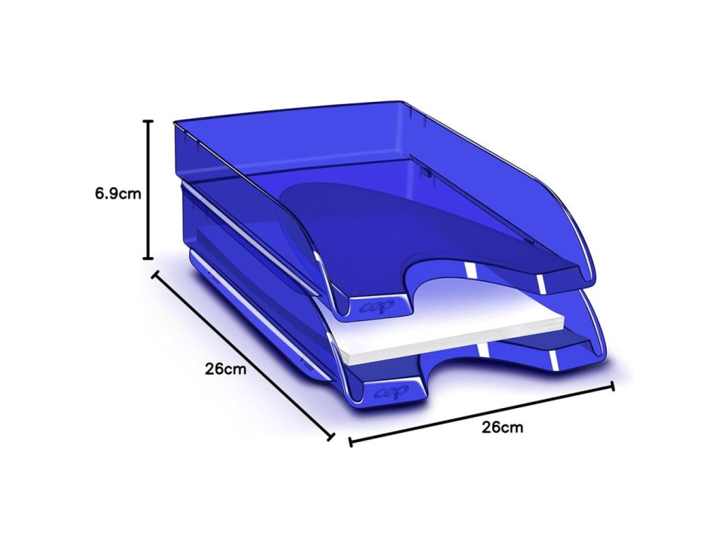 Vďaka štíhlym a elegantným líniám si tento odkladač nájde miesto nielen na stole, ale aj na bočnom stole alebo v skrini. Je vhodný na dokumenty do veľkosti 24 × 32 cm. Široký čelný výrez umožňuje ľahké vyberanie obsahu. Odkladač je stohovateľný vertikálne, aj stupňovito dozadu. Kapacita 450 listov (80 g / m²). Celkové rozmery 257 × 348 × 66 mm. Materiál 100% odolný vysokokvalitný plast. Jednotlivé kusy sa môžu navzájom jemne farebne líšiť. Väčšie balenie 10 ks. Farba transparentná modrá.Dodatočné parametre