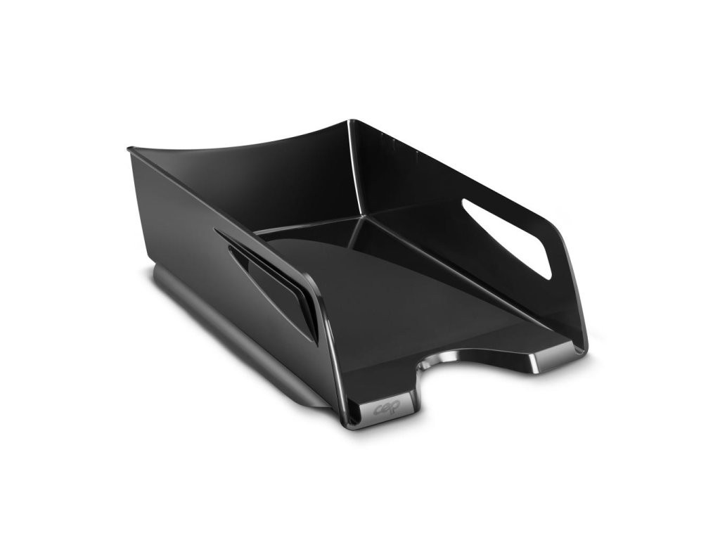 Elegantný, praktický a veľmi robustný široký odkladač na veľké dokumenty. Široký čelný výrez na ľahké vyberanie obsahu, dve bočné držadlá. Vertikálne stohovanie alebo stohovanie stupňovito dozadu. Materiál recyklovateľný polystyrén odolný voči nárazom. Rozmery 365 × 387 × 115 mm. Väčšie balenie 6 ks. Farba čierna.Dodatočné parametre