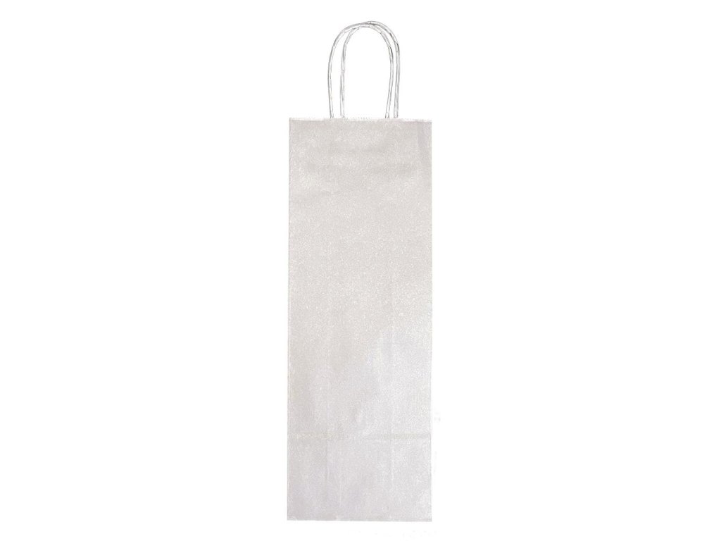 Papierová taška na víno. Farba strieborná. Ušká stáčané. Gramáž papiera 110g. Cena za kus. Rozmery v mm(š × h × v) 140 × 80 × 390.