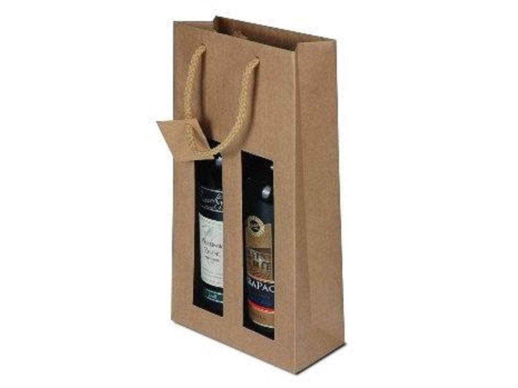Papierová taška na 2 fľašky vína s okienkami. Taška má bavlnené ušká na nesenie. Ideálne riešenie na darčekové balenie. Farba hnedá.VNÚTORNÝ ROZMER V mm (D Š V): 180 x 90 x 380 mm