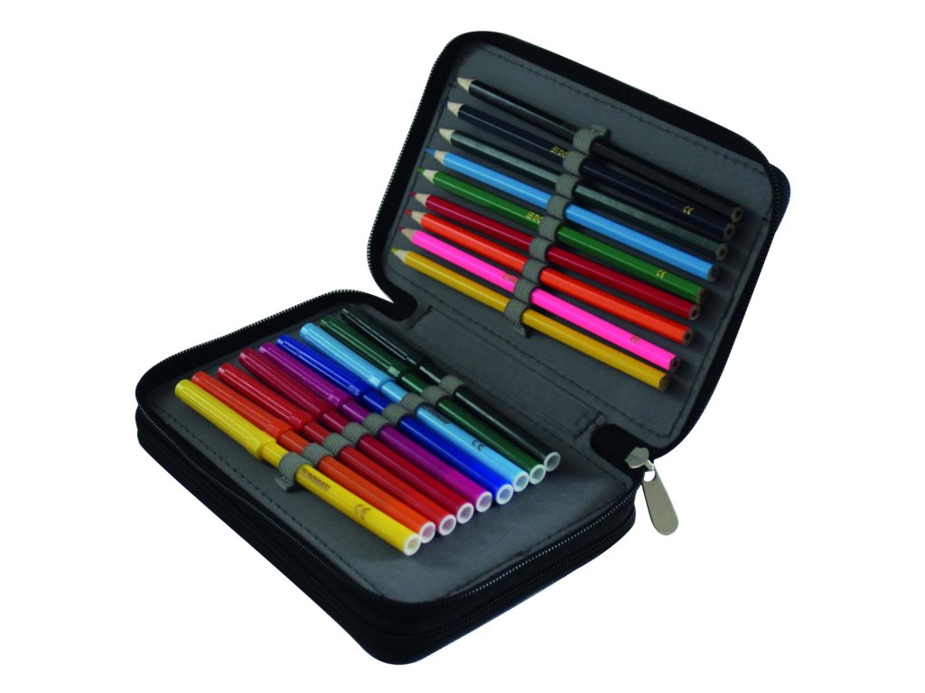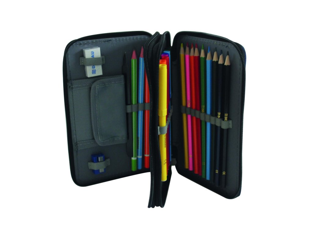 Peračník 2-zipsový s výbavou, v 6 rôznych dizajnoch. S praktickým vnútorným vreckom na drobnosti, vyrobený z odolného polyesterového materiálu. Výbava (23 dielov): 1 guma, 1 strúhadlo, 3 ceruzky, 1 pravítko, 1 rozvrh hodín, 8 fixiek, 8 farebných ceruziek. Rozmery: Š x V x H: 200 x 40 x 130 mm.Materiál: polyester