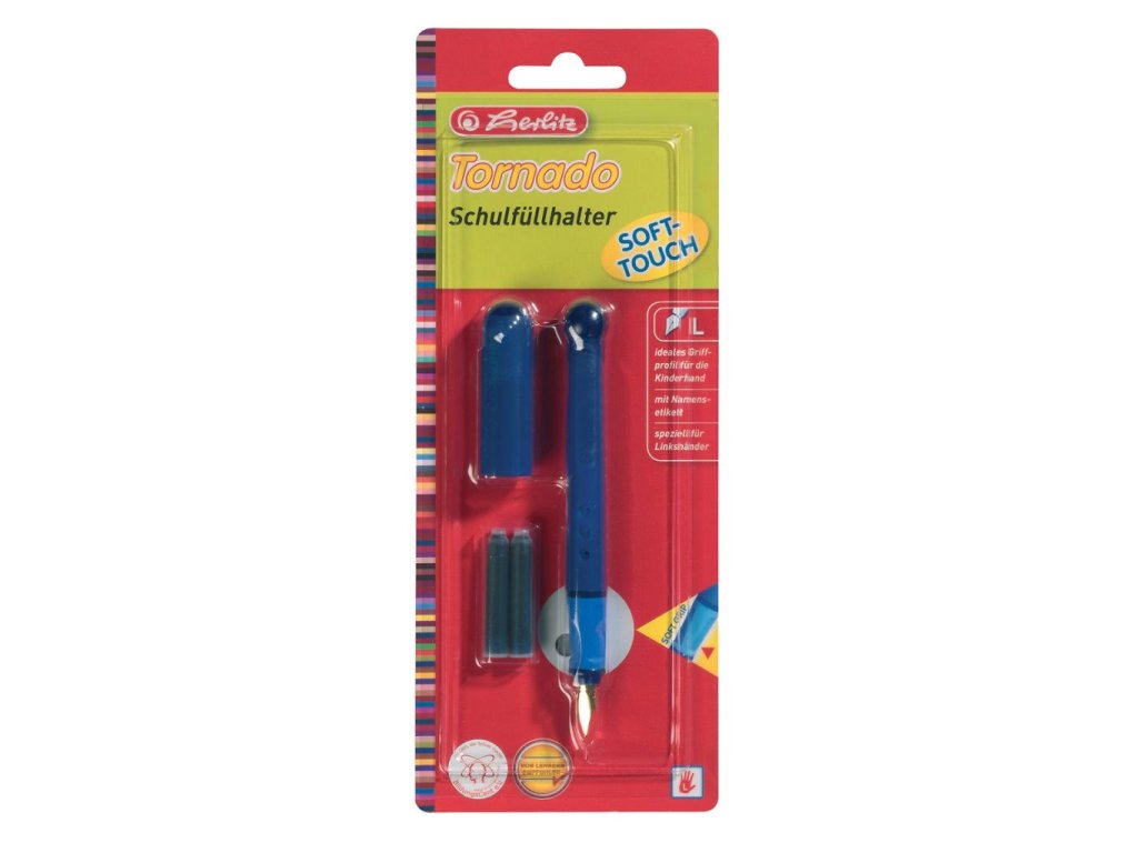 Plniace bombičkové pero L - Tornado - pre ľavákov, hrot z ušľachtilej ocele, ergonomické pogumované držanie, nálepka s menom, balenie v blistri, mix farieb.Dodatočné parametre